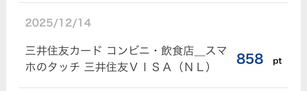実際の明細でも、コンビニ・飲食店のスマホのタッチ決済で858ptと、“日常”の利用でポイントが付いているのが確認できました。